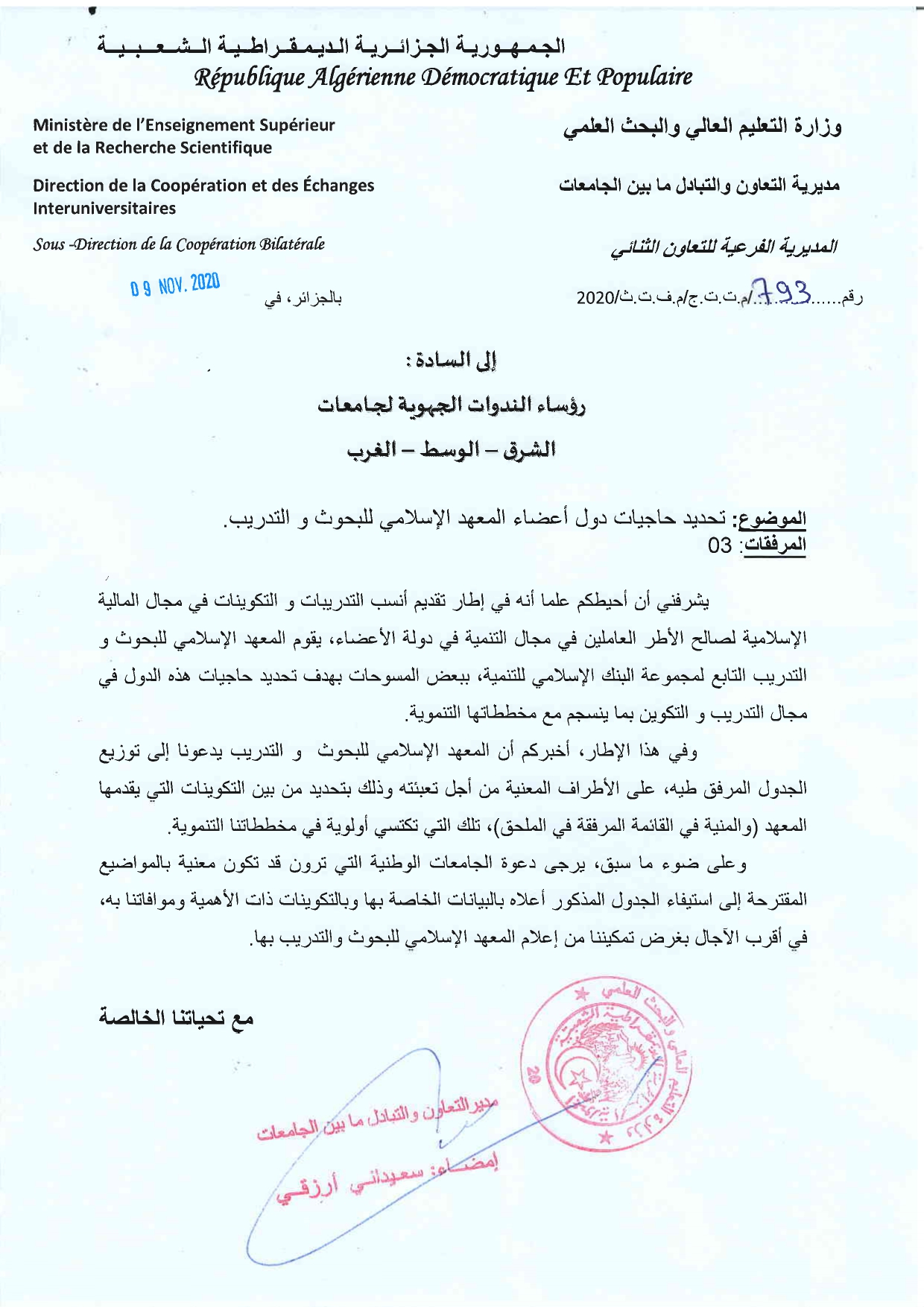 DCEIU du MESRS relatif à la détermination des besoins en terme de formation dans le domaine de la finance islamique pour les pays membres de l’Institut Islamique de Recherche et de Formation affilié au Groupe de la Banque Islamique de Développement (BID).