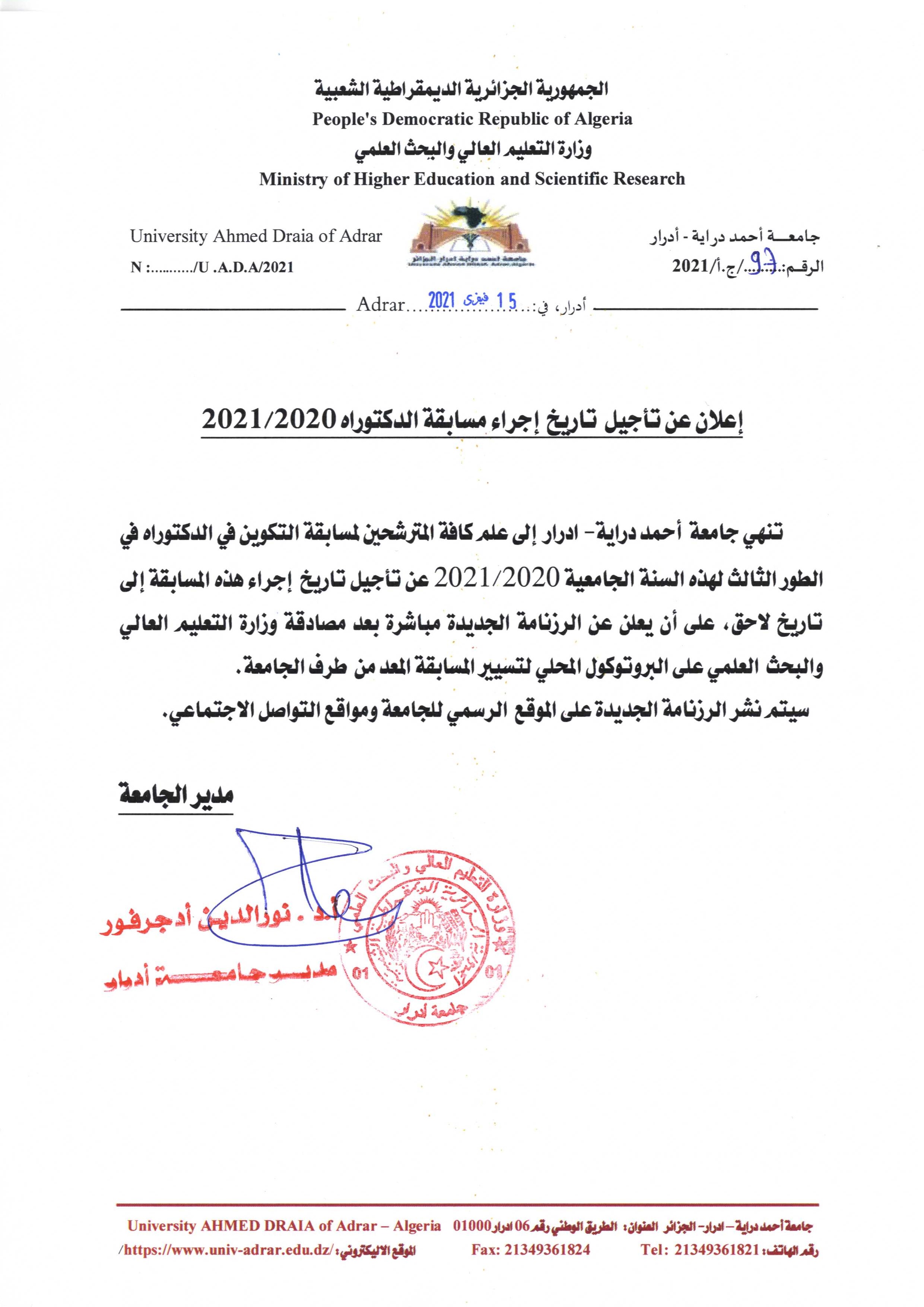 إعلان عن تأجيل تاريخ إجراء مسابقة الدكتوراه 2021/2020 1٬839 Share FacebookGoogle+البريد الإلكترونيTwitter