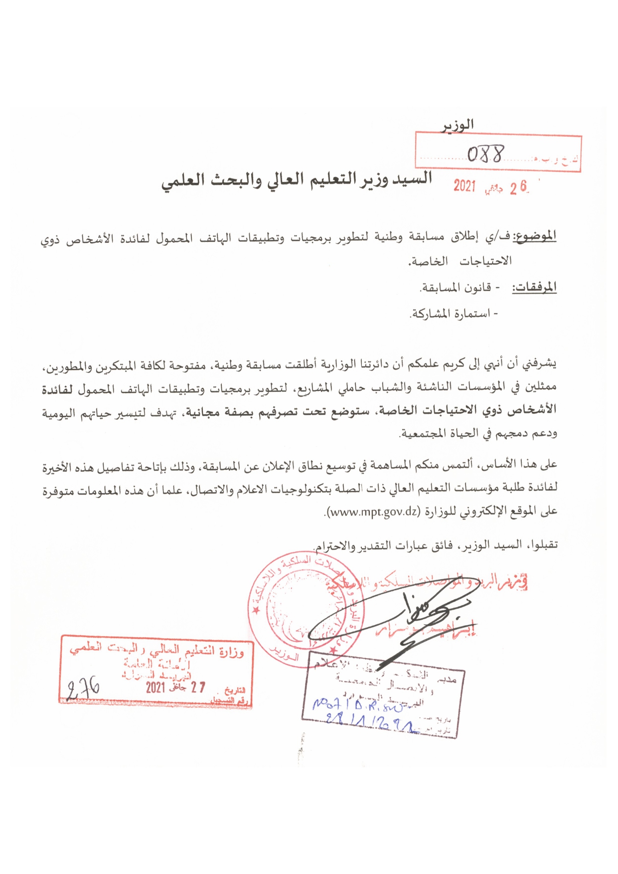 إطلاق مسابقة وطنية لتطوير برمجيات وتطبيقات الهاتف المحمول لفائدة الأشخاص ذوي الاحتياجات الخاصة استمارة المعلومات للشخص الطبيعي 570 Share FacebookGoogle+البريد الإلكترونيTwitter
