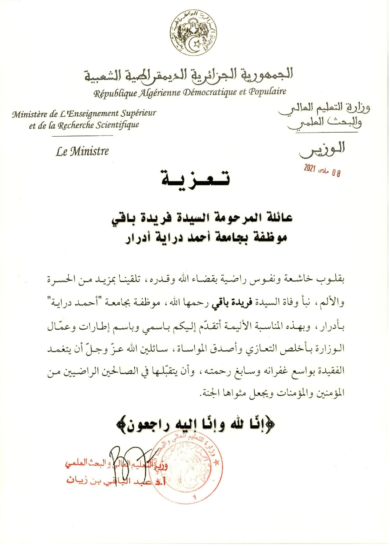 وزير التعليم العالي و البحث العلمي يعزي عائلة المرحومة “فريدة باقي” 888 Share FacebookGoogle+البريد الإلكترونيTwitter
