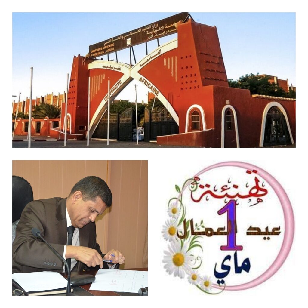 تيمناً وتبركاً بقوله تعالى: (وَقُلِ اعْمَلُوا فَسَيَرَى اللَّهُ عَمَلَكُمْ وَرَسُولُهُ وَالْمُؤْمِنُونَ وَسَتُرَدُّونَ إِلَى عَالِمِ الْغَيْبِ وَالشَّهَادَةِ فَيُنَبِّئُكُمْ بِمَا كُنْتُمْ تَعْمَلُونَ) [التوبة 105] أتقدّم إلى كافة أسرة التعليم العالي والبحث العلمي بجامعة أحمد دراية بأدرار .. أساتذة وإطارات وإداريين وعمال بأخلص التهاني بمناسبة عيد العمال .. الذي تزامن هذه السنة مع شهر فضيل وما فيه من النفحات الطيبات المباركة، داعيا الله عز وجل أن يبارك للجميع أعمالهم ويوفقهم لما فيه خير هذه المؤسسة العلمية والرقي بها نحو أفضل المراتب.