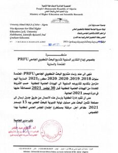 مذكرة بخصوص ايداع التقارير السنوية لمشاريع البحث التكويني الجامعي PRFU المعتمدة و السارية 919 Share FacebookGoogle+البريد الإلكترونيTwitter