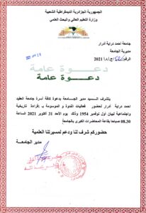 دعوة عامة لحضور فعاليات الندوة التاريخية “قراءة تاريخية واجتماعية لبيان أول نوفمبر 1954” 725 Share FacebookGoogle+البريد الإلكترونيTwitter