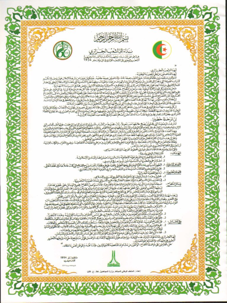 ملخص: يعتبر ”بيان أول نوفمبر 1954م” من أهم الوثائق التاريخية التي أسّست لمرحلة هامة من تاريخ الجزائر، و ربطت بين جيل الثورة و جيل الاستقلال وفق مبادئ وقيم سامية تجمع بين الحضارة و الإنسانية و صدق الانتماء للأوطان، لهذا كانت ثمرتها موضوعية واقعية أفضت إلى استقلال الجزائر والدفاع عن كل معاني الحرية و العدالة، والسعي نحو حماية حقوق الإنسان في كل المجتمعات المضطهدة عبر العصور المختلفة.