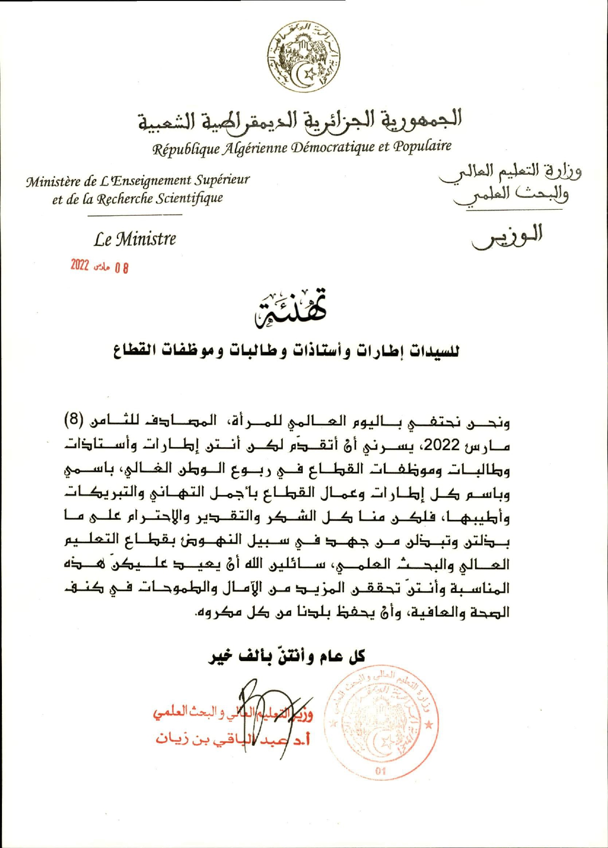 تهنئة السيد الوزير للسيدات إطارات وأستاذات وطالبات وموظفات القطاع 571 Share FacebookGoogle+البريد الإلكترونيTwitter