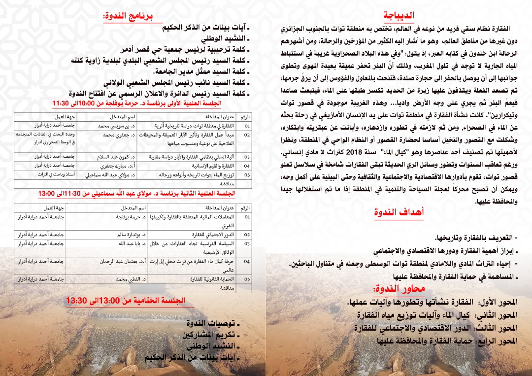 ندوة حول الفقارة ودورها الاقتصادي والاجتماعي في منطقة توات 1٬163 Share FacebookGoogle+البريد الإلكترونيTwitter