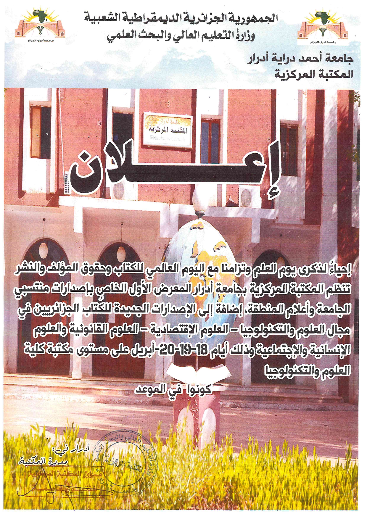 المكتبة المركزية بجامعة ادرار تنظم المعرض الأول الخاص بإصدرات منتسبي الجامعة وأعلام المنطقة 733 Share FacebookGoogle+البريد الإلكترونيTwitter