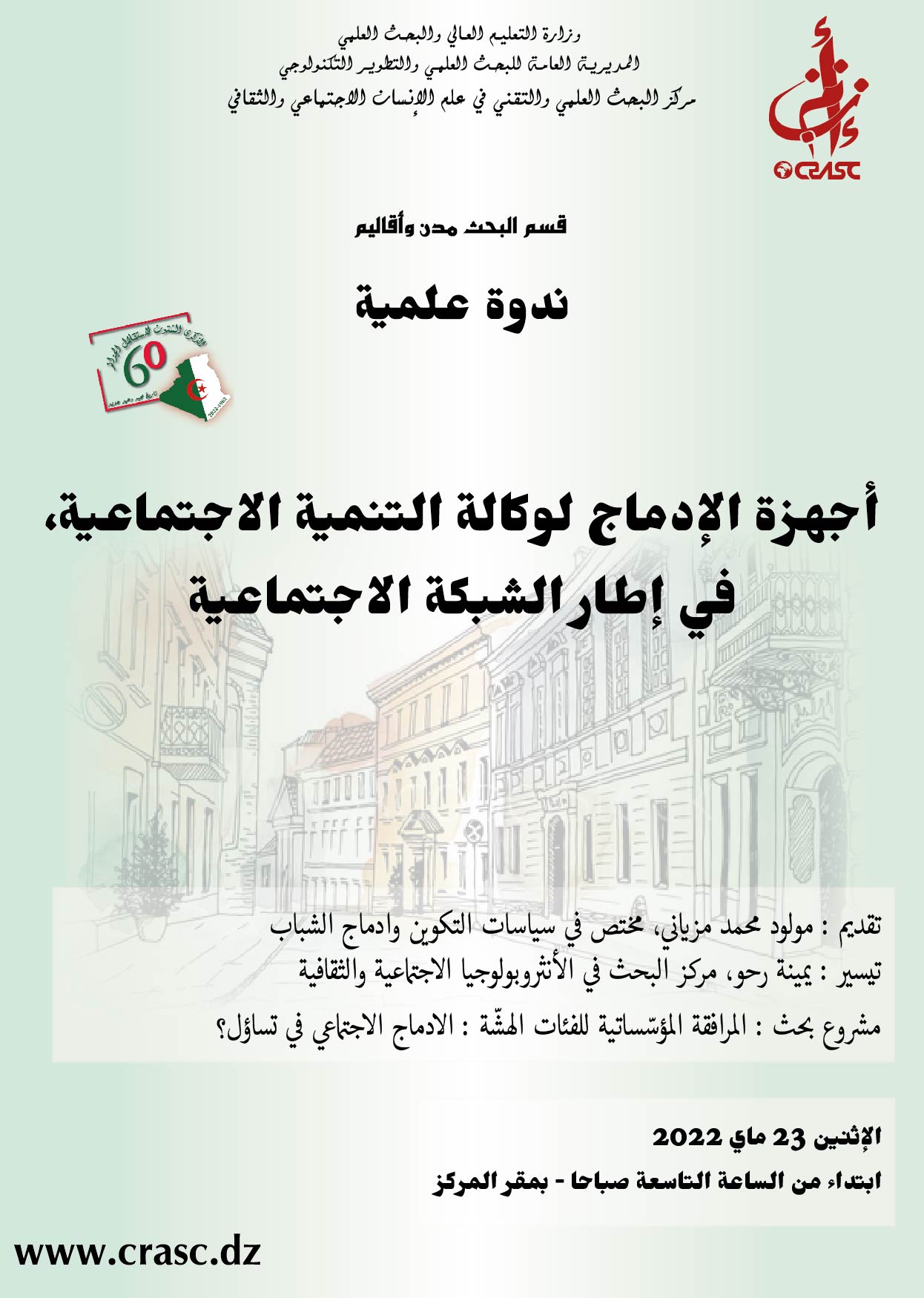 ندوة علمية موسومة بـ ” أجهزة الإدماج لوكالة التنمية الاجتماعية، في إطار الشبكة الاجتماعية” 1٬012 Share FacebookGoogle+البريد الإلكترونيTwitter