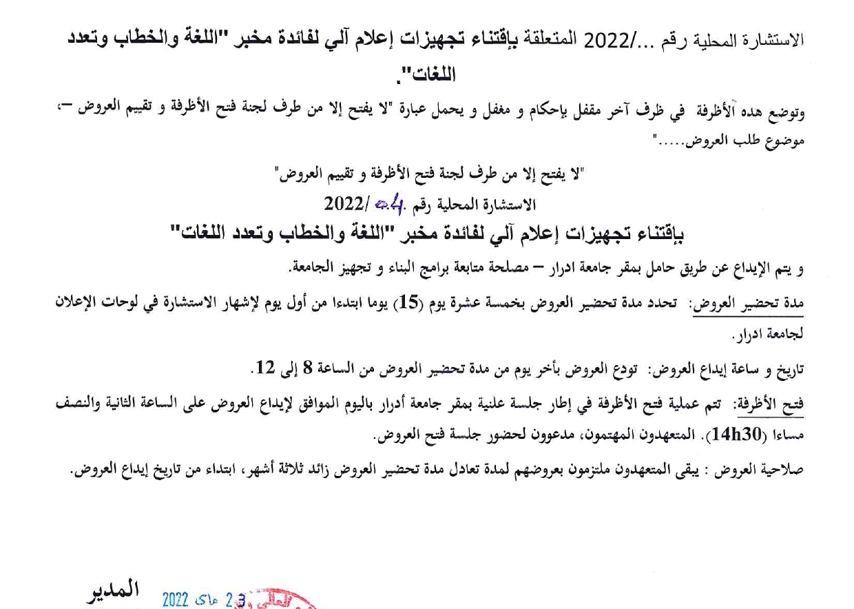استشارة محلية: اقتناء تجهيزات إعلام آلي لفائدة مخبر “اللغات والخطاب وتعدد اللغات” 1٬072 Share FacebookGoogle+البريد الإلكترونيTwitter