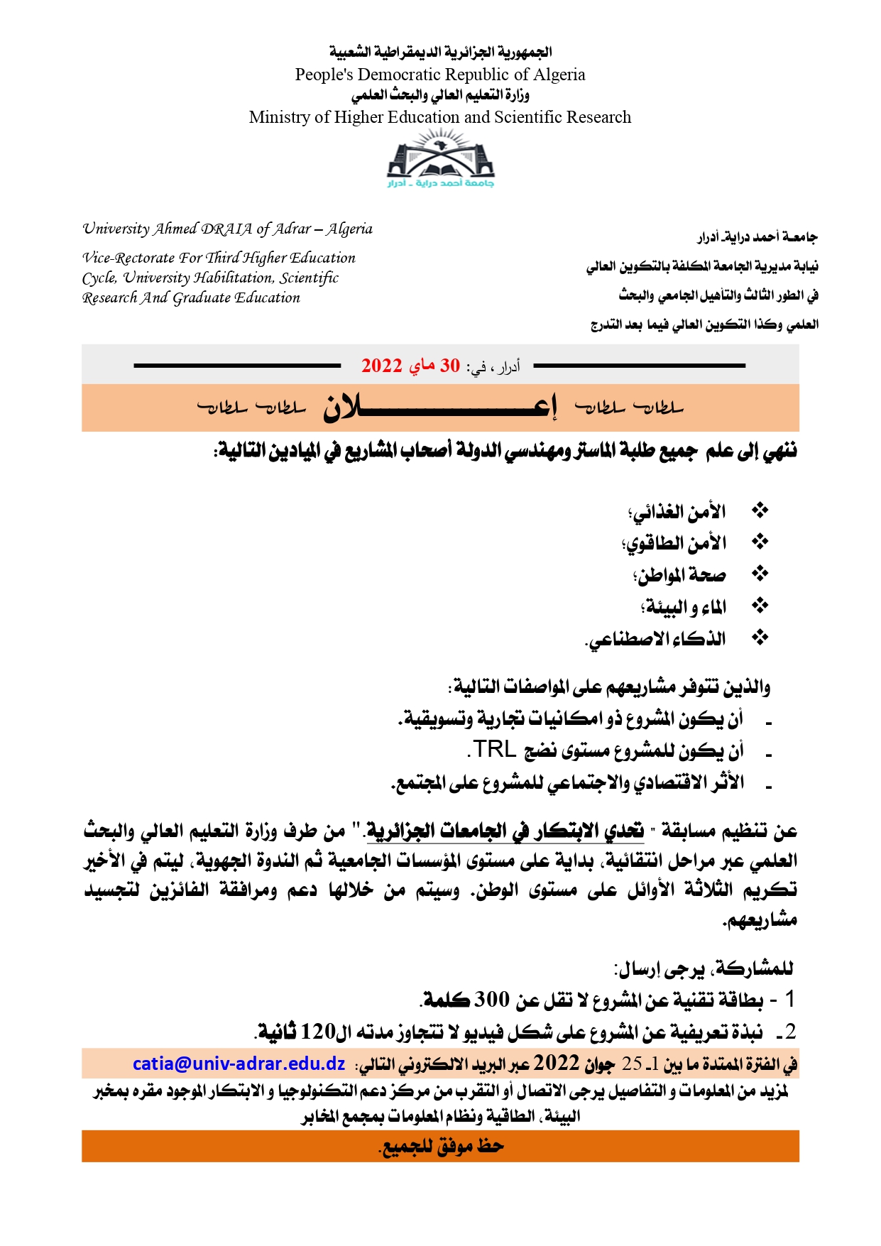 مسابقة تحدي الابتكار في الجامعات الجزائرية ملفات للتحميل Fiche technique pour le concours IBTIKAR 2022 Annexe 01 : Niveaux de maturité des technologies (TRL) Annexe 02 : Les domaines du concours الملحق رقم 01 : جدول يتضمن مستويات الجاهزية التكنولوجية (TRL) الملحق رقم 02: ميادين المسابقة ورقة تقنية للمــــــــــــــشروع 994 Share FacebookGoogle+البريد الإلكترونيTwitter