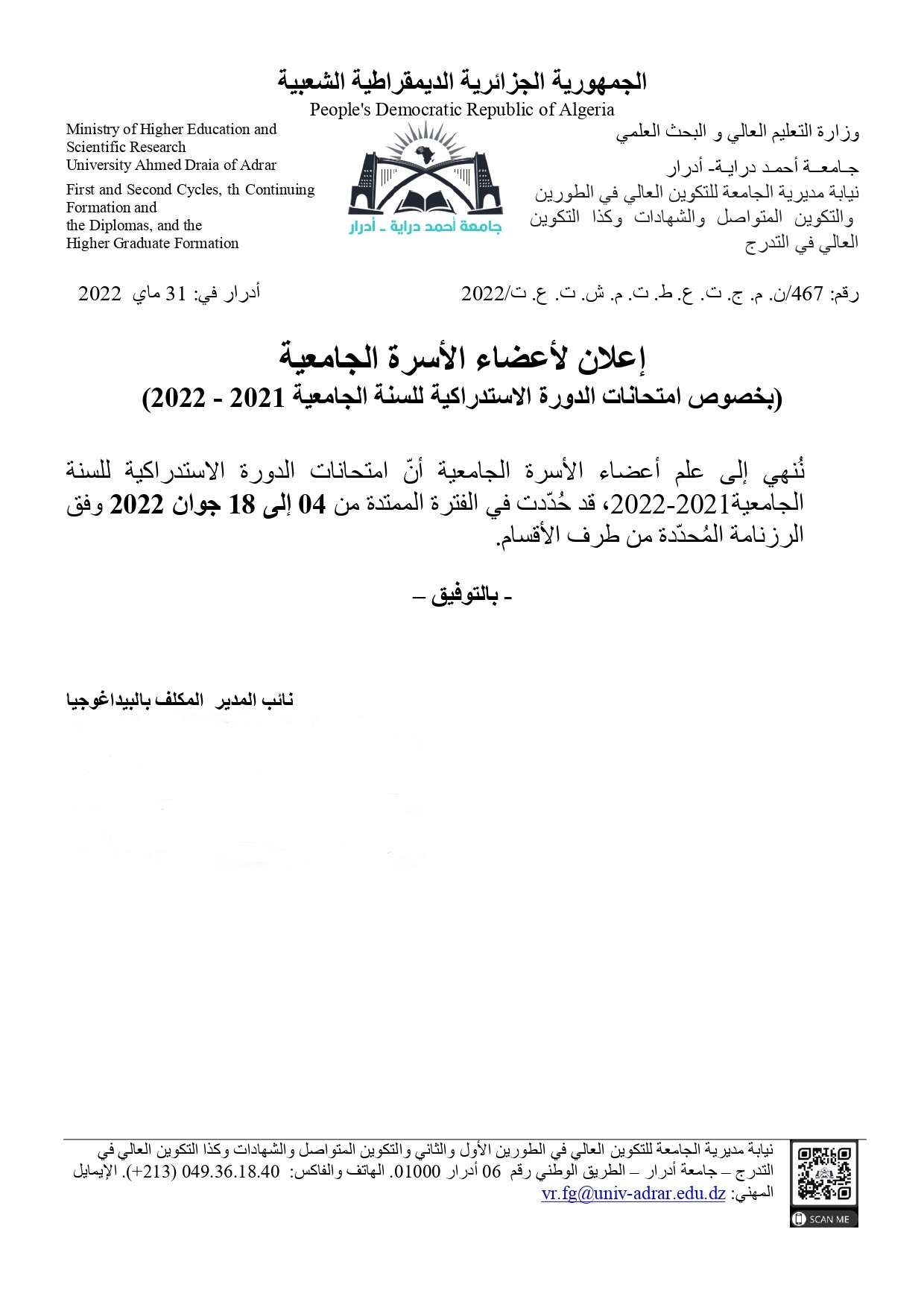إعلان بخصوص الامتحانات الاستدراكية للسنة الجامعية 2021-2022 746 Share FacebookGoogle+البريد الإلكترونيTwitter