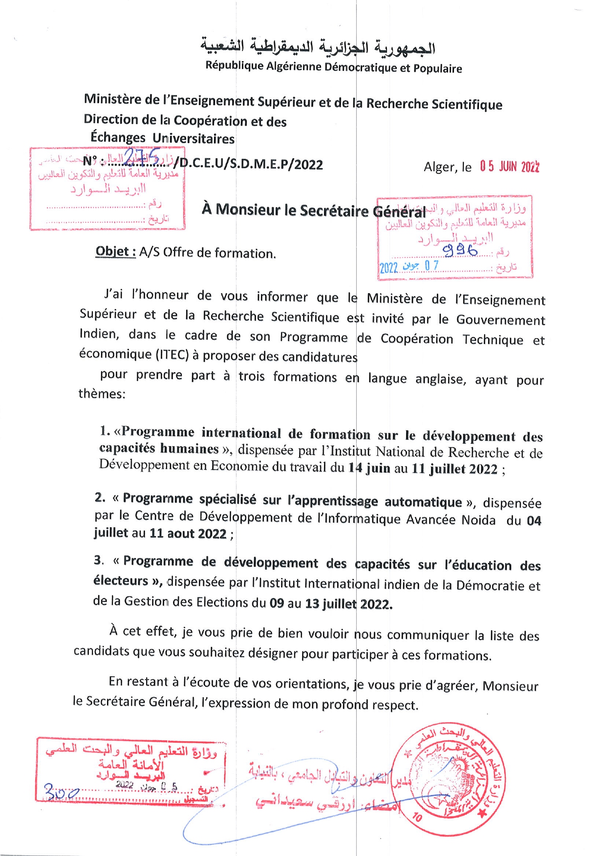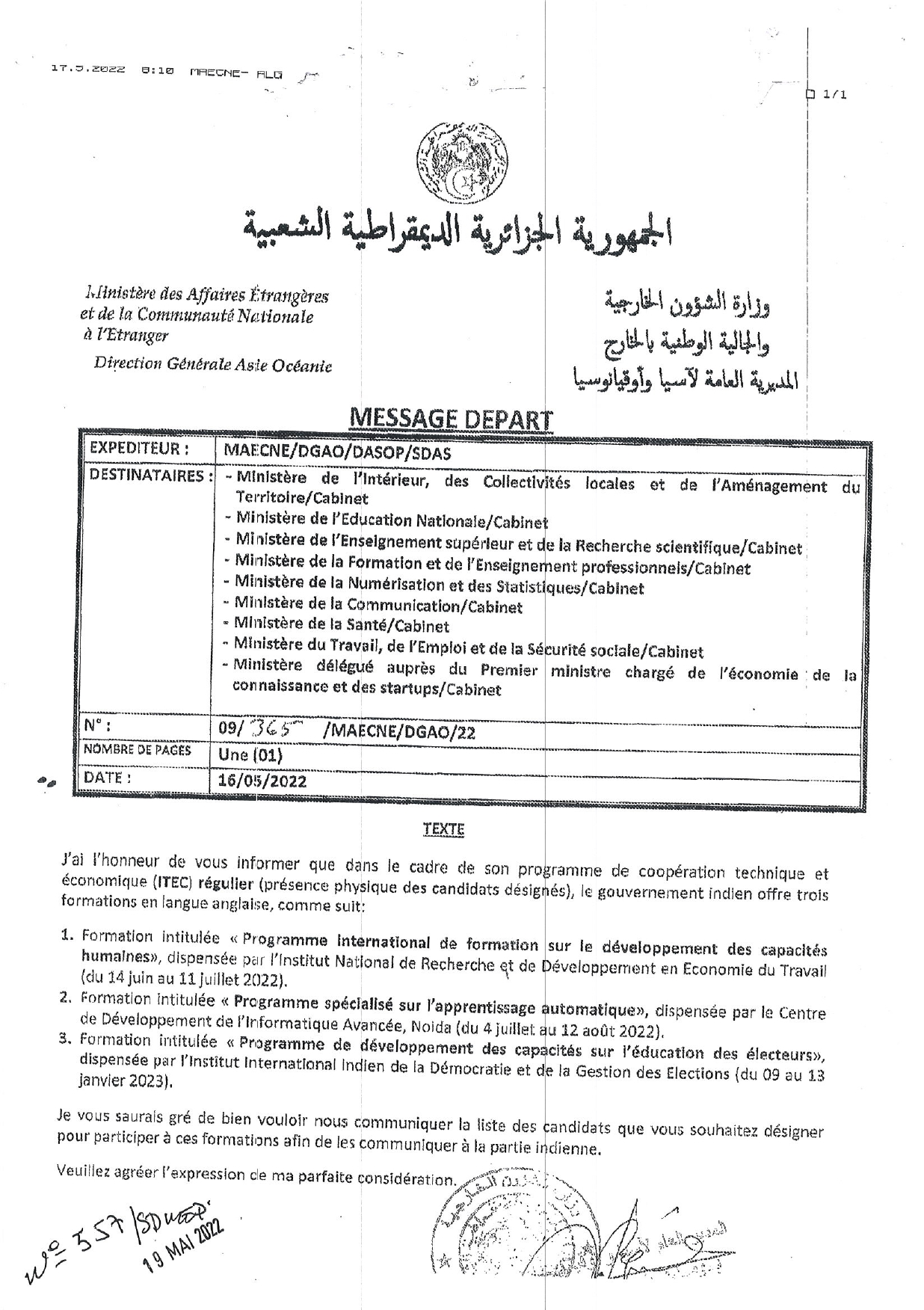 Envoi MESRS A/S Offre de formations du gouvernement Indien 1٬121 Share FacebookGoogle+البريد الإلكترونيTwitter