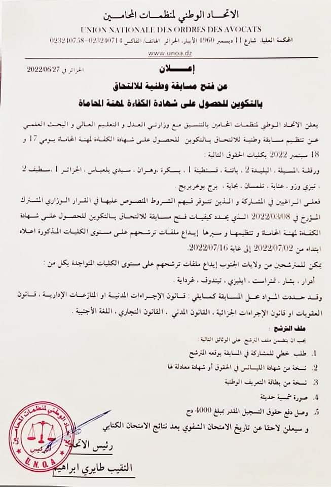 اعلان عن فتح مسابقة وطنية للألتحاق بالتكوين للحصول على شهادة الكفاءة لمهنة المحاماة 18٬826 Share FacebookGoogle+البريد الإلكترونيTwitter