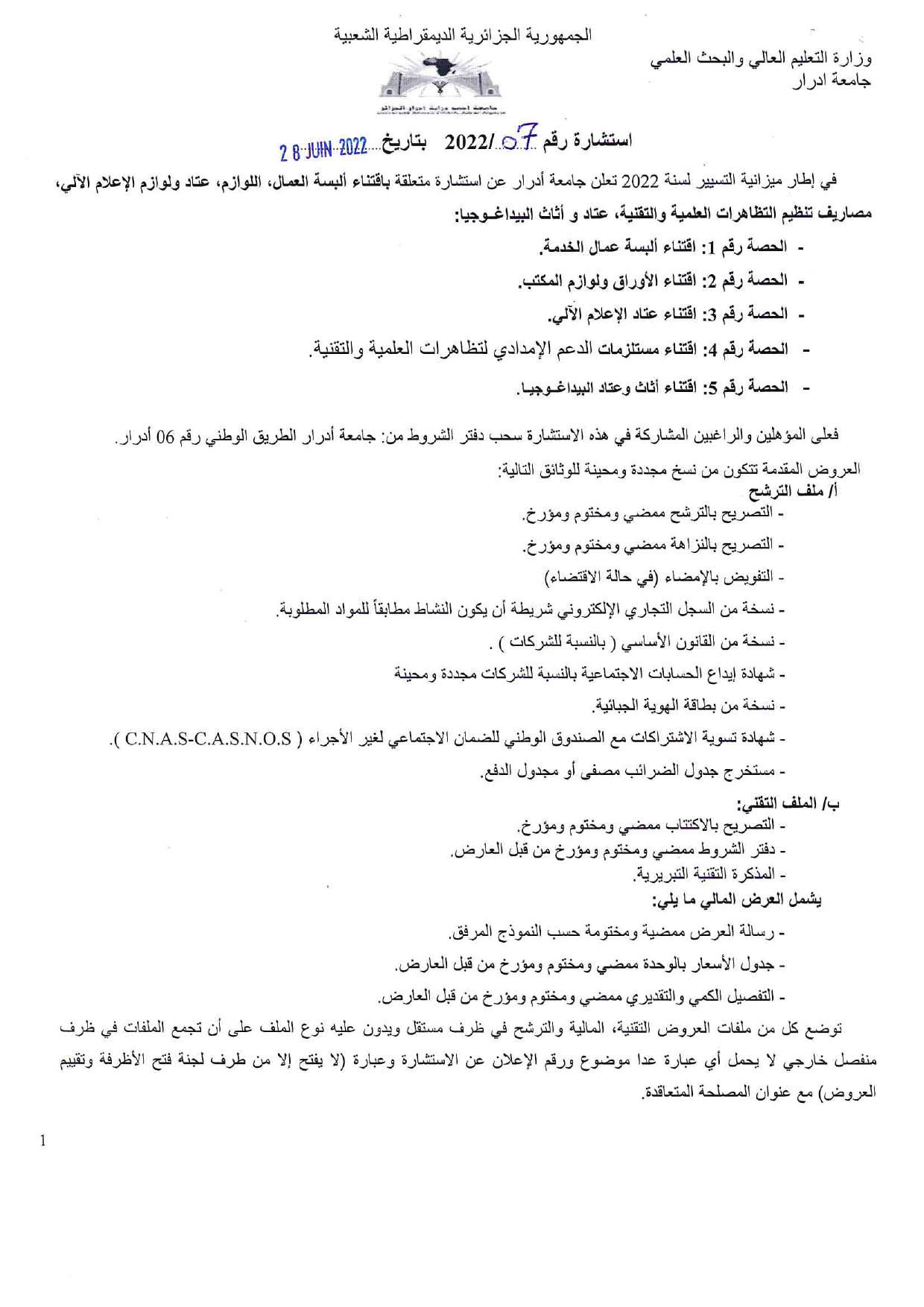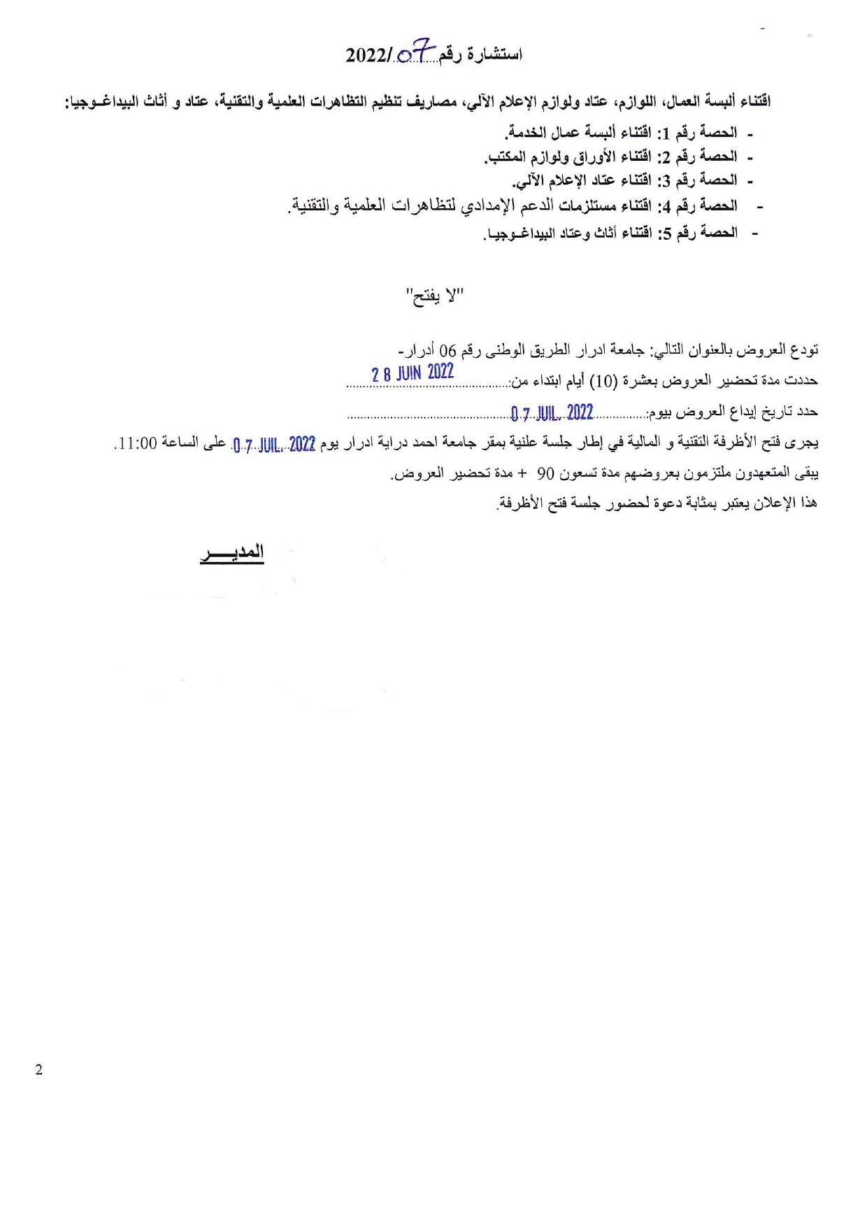 استشارة متعلقة باقتناء ألبسة العمال, اللوازم, عتاد ولوازم الاعلام الآلي, مصاريف تنظيم التظاهرات العلمية والتقنية, وأثاث البيداغوجيا 955 Share FacebookGoogle+البريد الإلكترونيTwitter