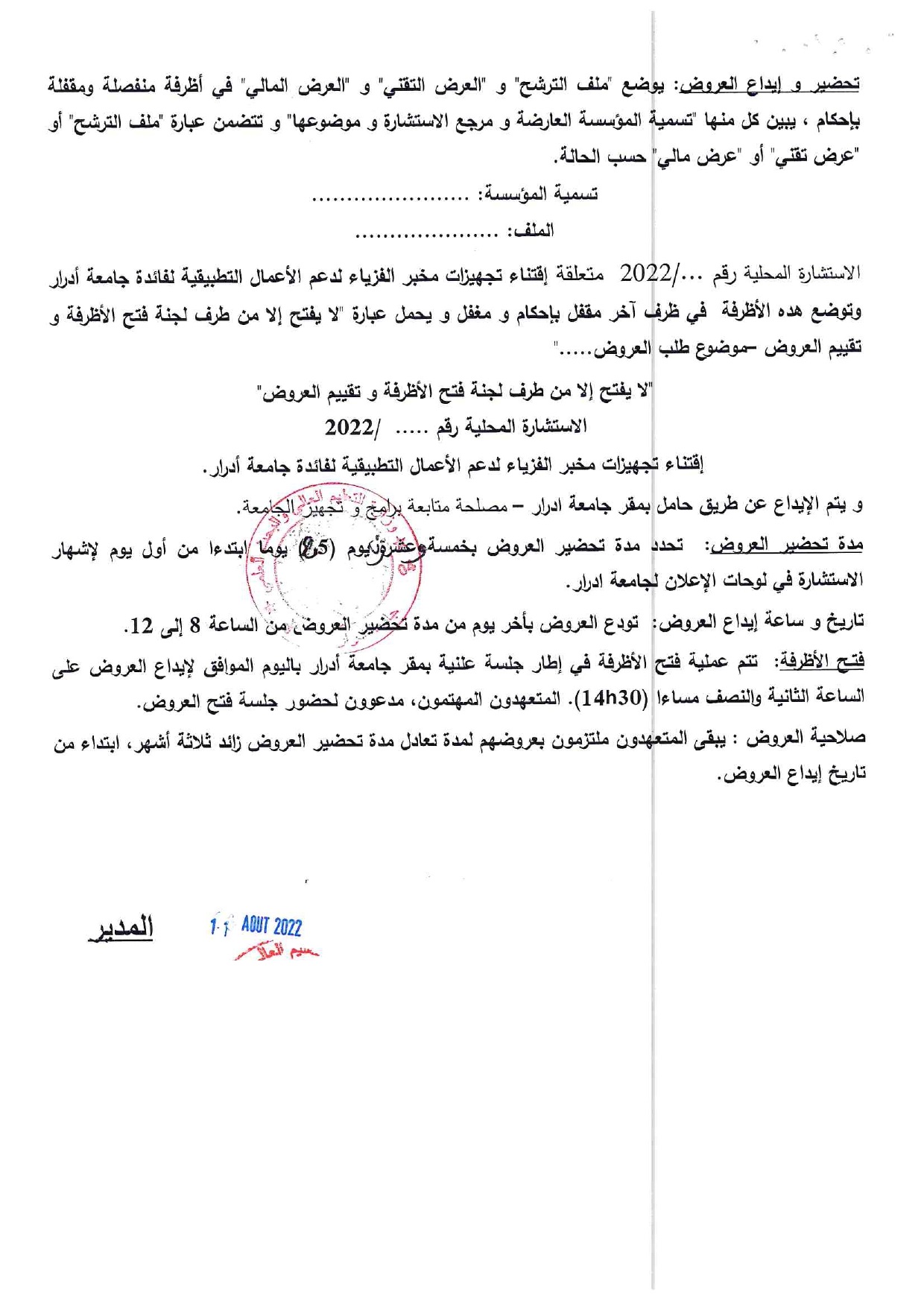 الاستشارة المحلية رقم 2022/06 اقتناء تجهيزات مخبر الفيزياء لدعم الأعمال التطبيقية لفائدة جامعة أدرار 2٬465 Share FacebookGoogle+البريد الإلكترونيTwitter