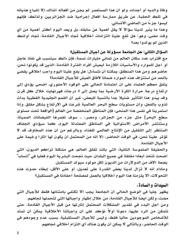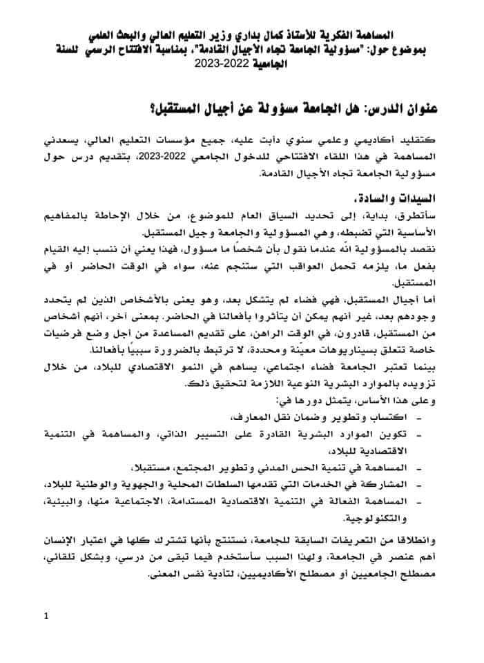 المساهمة الفكرية للاستاذ كمال بداري وزير التعليم والبحث العلمي بموضوع حول مسؤولية الجامعة تجاه الاجيال القادمة 585 Share FacebookGoogle+البريد الإلكترونيTwitter