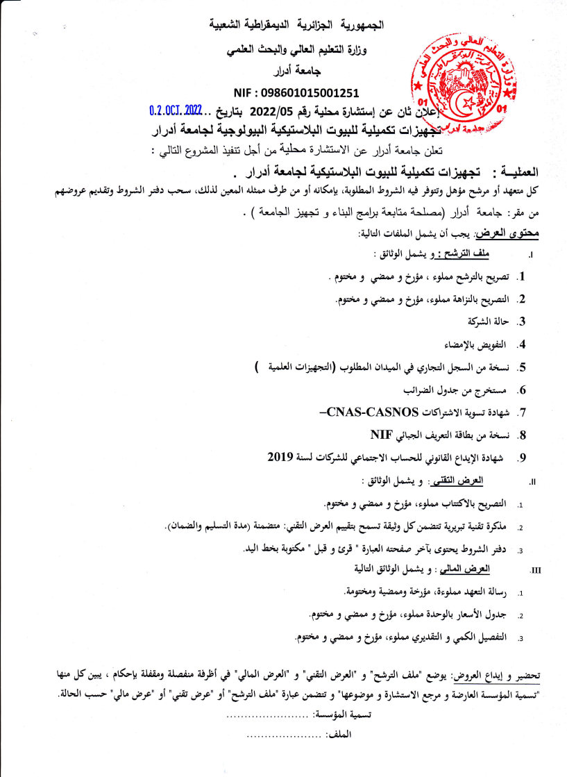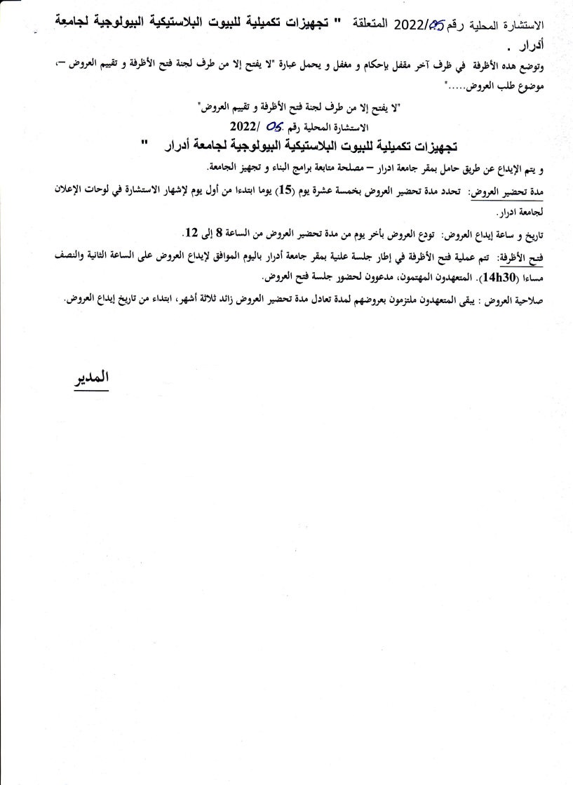 إستشارة محلية رقم 2022/05 تجهيزات تكميلية للبيوت البلاستيكية البيولوجية لجامعة ادرار 642 Share FacebookGoogle+البريد الإلكترونيTwitter