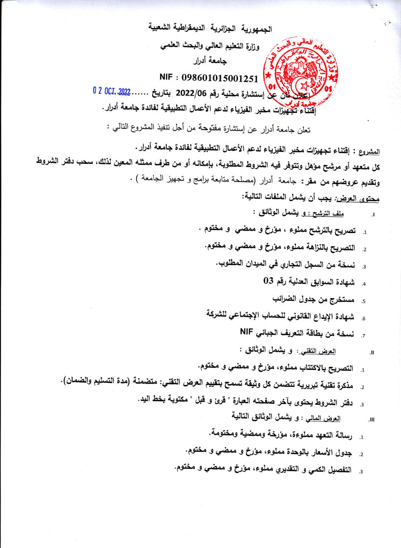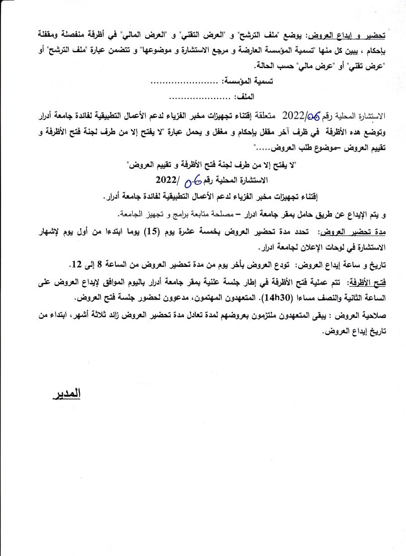 إستشارة محلية رقم 2022/06 إقتناء تجهيزات مخبر الفيزياء لدعم الأعمال التطبيقية لفائدة جامعة ادرار 661 Share FacebookGoogle+البريد الإلكترونيTwitter