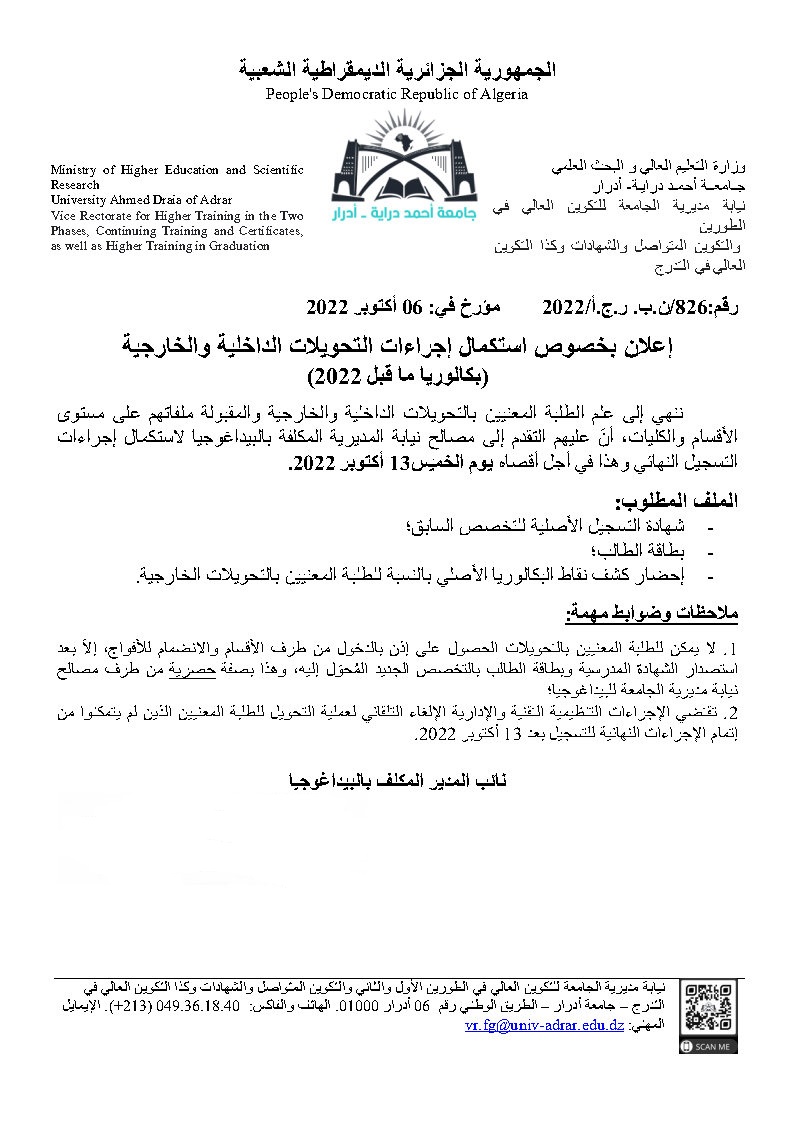 إعلان بخصوص استكمال إجراءات التحويلات الداخلية والخارجية (بكالوريا ما قبل 2022) 482 Share FacebookGoogle+البريد الإلكترونيTwitter