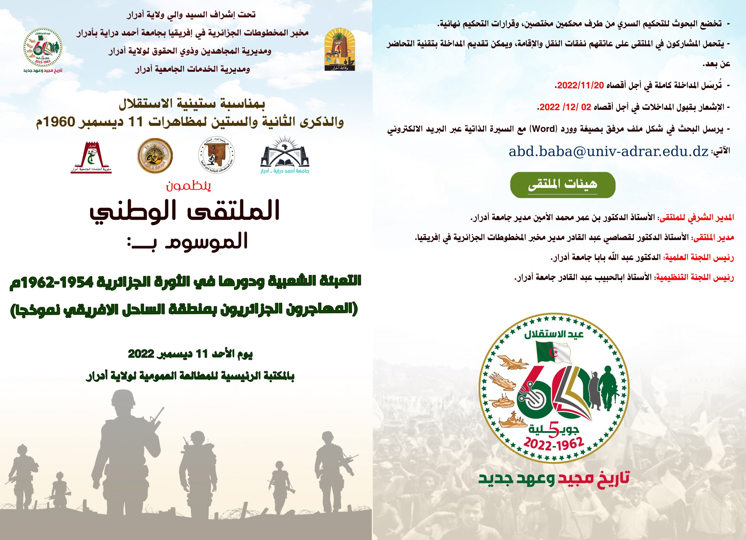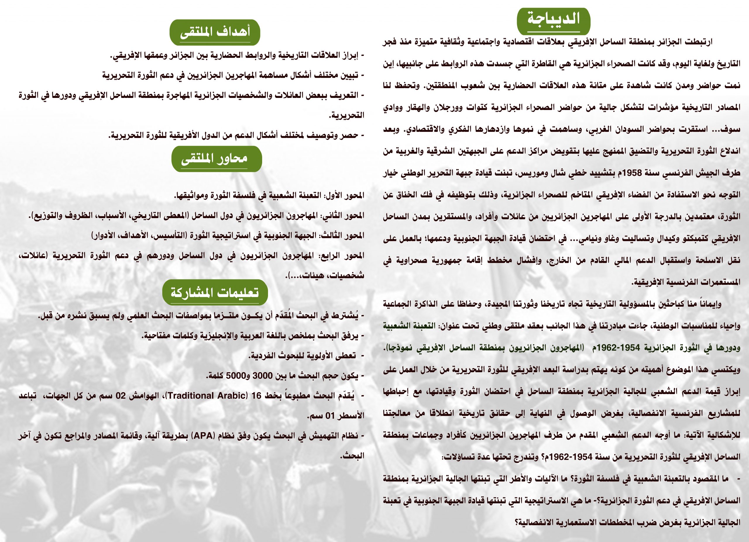 الملتقى الوطني الموسوم ب:التعبئة الشعبية ودورها في الثورة الجزائرية 1954-1962م (المهاجرون الجزائريون بمنطقة الساحل الافريقي نموذجا) 916 Share FacebookGoogle+البريد الإلكترونيTwitter
