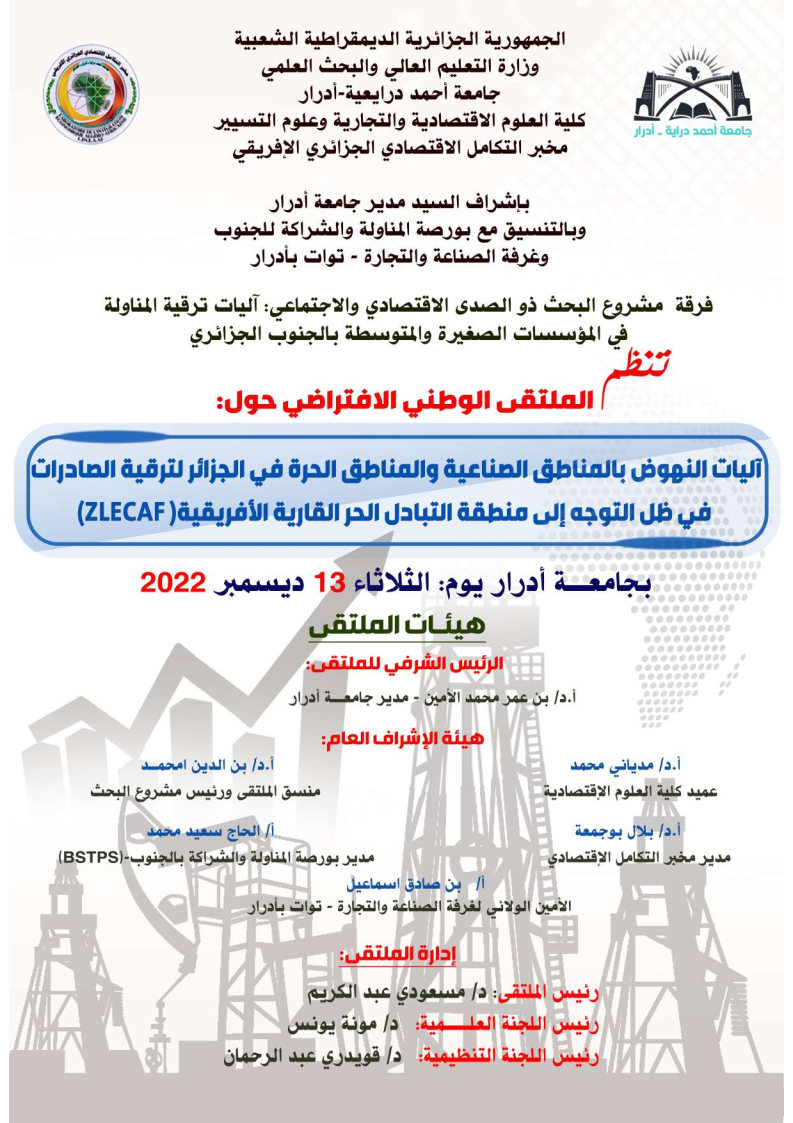الملتقى الوطني الافتراضي حول : آليات النهوض بالمناطق الصناعية والمناطق الحرة في الجزائر لترقية الصادرات في ظل التوجه إلى منطقة التبادل الحر القارية الافريقية (ZLECAF)