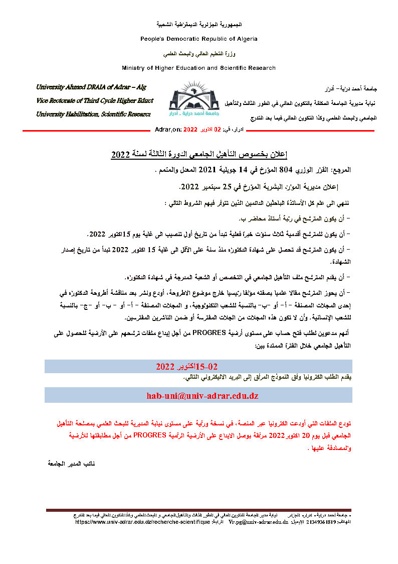 اعلان بخصوص ايداع ملف التاهيل الجامعي الورقي الى نيابة البحث العلمي ( مصلحة التاهيل الجامعي ) 648 Share FacebookGoogle+البريد الإلكترونيTwitter