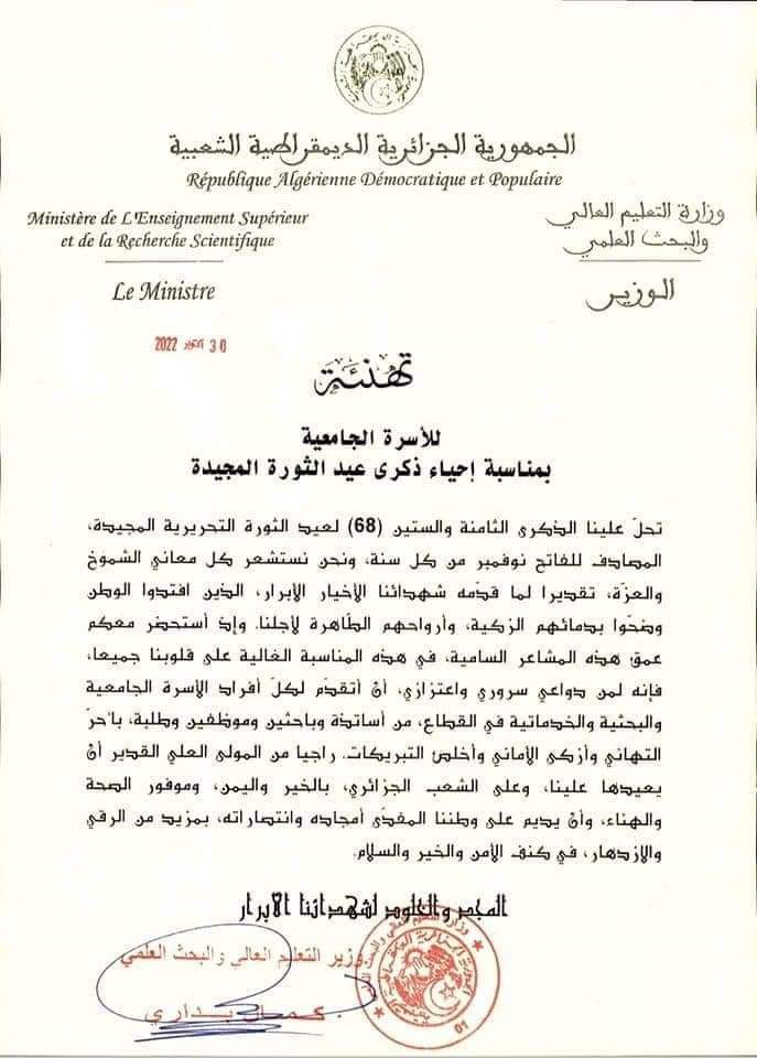 تهنئة السيد الوزير للأسرة الجامعية بمناسبة إحياء ذكرى عيد الثورة المجيدة 469 Share FacebookGoogle+البريد الإلكترونيTwitter