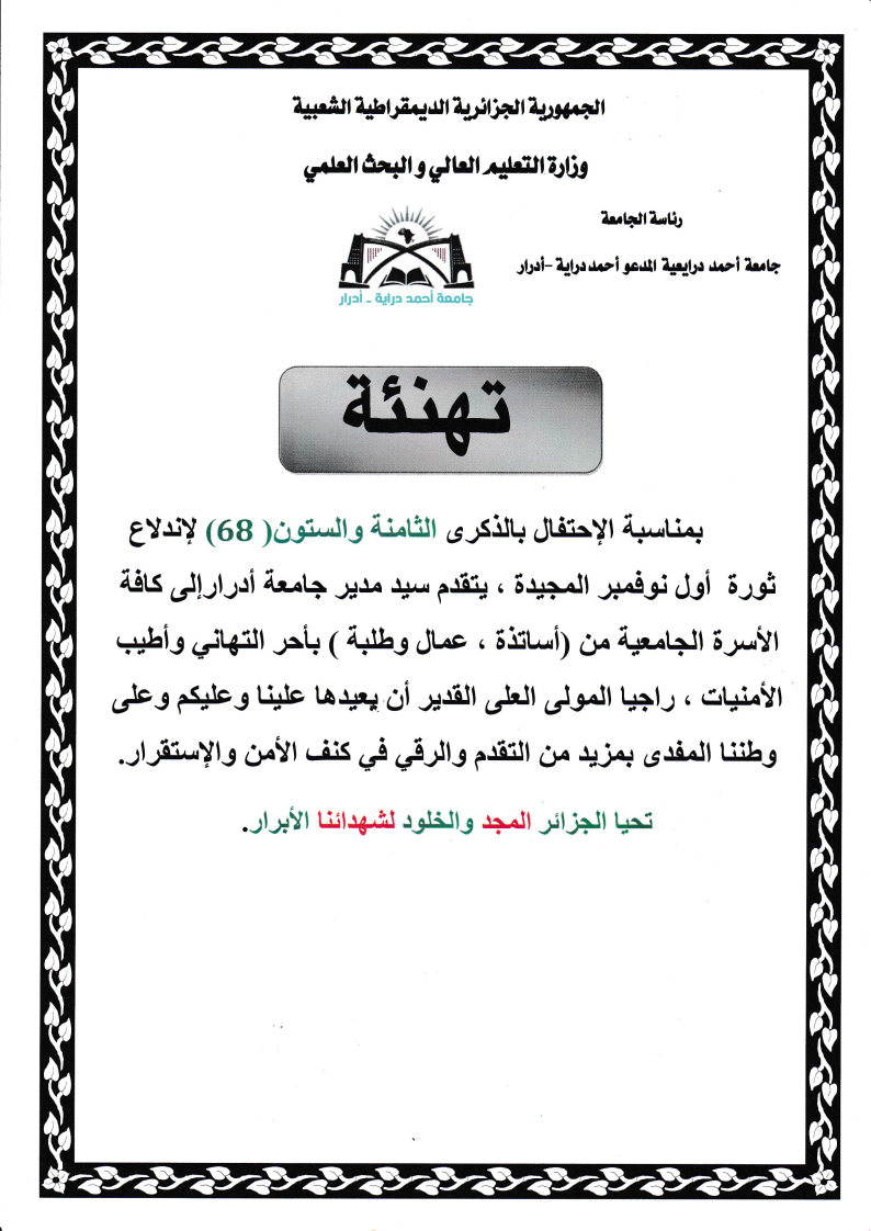 تهنئة السيد مدير الجامعة للأسرة الجامعية بمناسبة الإحتفال بالذكرى 68 لاندلاع ثورة أول نوفمبر المجيدة 665 Share FacebookGoogle+البريد الإلكترونيTwitter