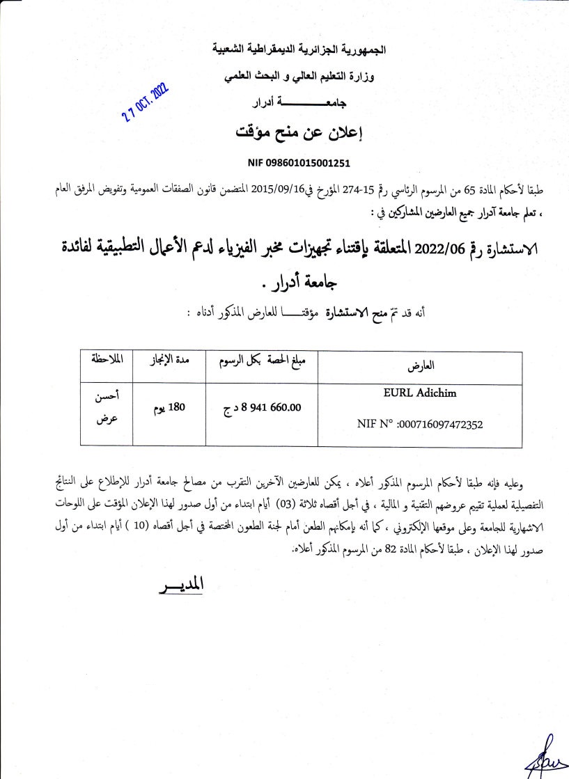 منح مؤقت للاستشارة رقم 2022/06 المتعلقة باقتناء تجهيزات مخبر الفيزياء لدعم الأعمال التطبيقية لفائدة جامعة ادرار 585 Share FacebookGoogle+البريد الإلكترونيTwitter