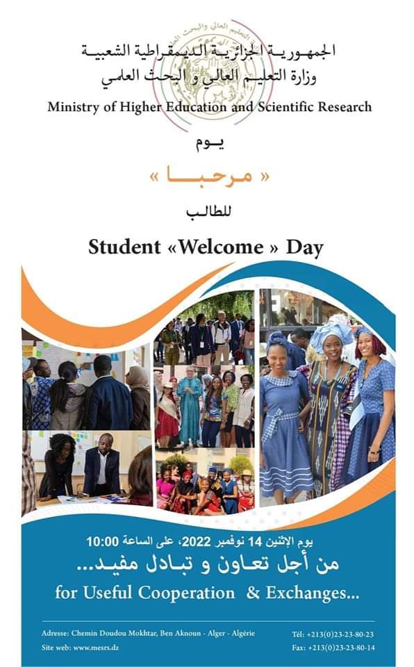 تعتزم وزارة التعليم العالي والبحث العلمي إرساء يوم ترحيبي تحت شعار “مرحبا” ” Student Marhaba Day ” لفائدة عموم الطلبة الأجانب الذين يزاولون دراساتهم في مختلف الأطوار بالمؤسسات الجامعية الجزائرية، وذلك باشراف من السيد وزير التعليم العالي والبحث العلمي يوم الإثنين 14 نوفمبر 2022، على الساعة 10:00 صباحا