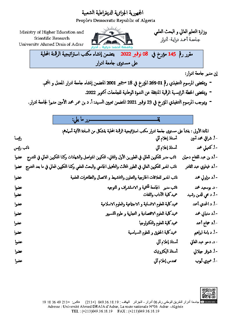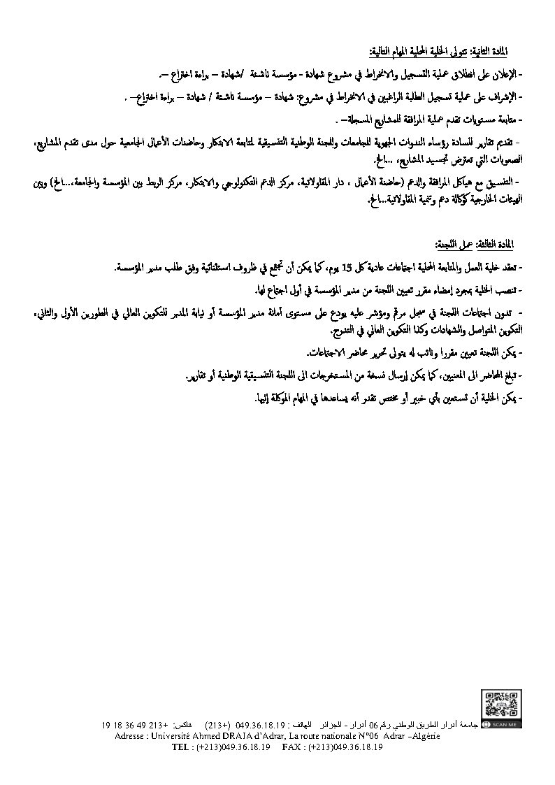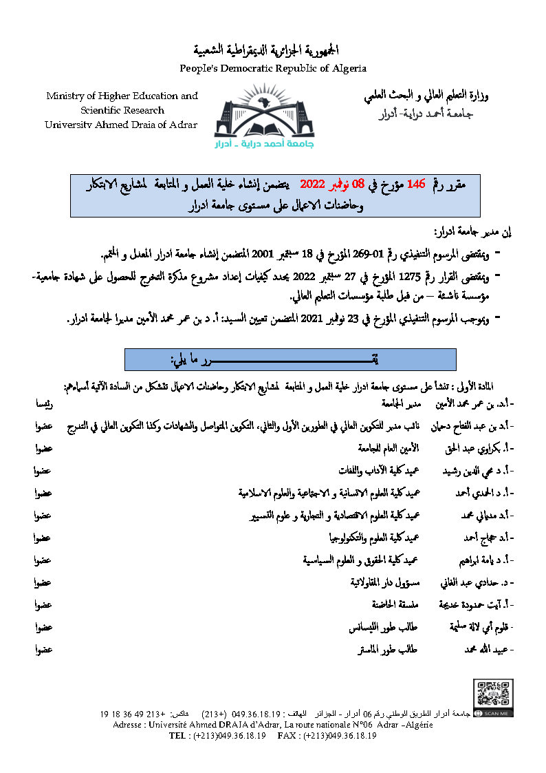 مقرر يتضمن إنشاء خلية العمل والمتابعة لمشاريع الابتكار وحاضنات الأعمال على مستوى جامعة أدرار 861 Share FacebookGoogle+البريد الإلكترونيTwitter