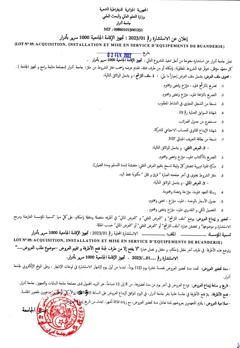 إعلان عن الاستشارة رقم 2023/01 : تجهيز الإقامة الجامعية 1000 سرير بأدرار 1٬457 Share FacebookGoogle+البريد الإلكترونيTwitter