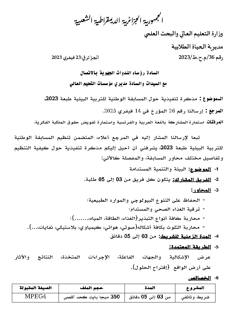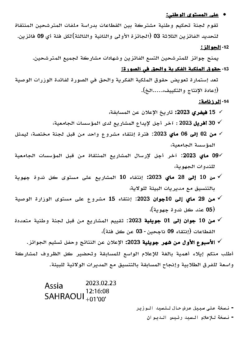 مذكرة تنفيذية حول المسابقة الوطنية للتربية البيئية طبعة 2023 لتحميل المرفقات : 1- استمارة المشاركة باللغة العربية 2- استمارة المشاركة باللغة الفرنسية 3- استمارة تفويض حقوق الملكية الفكرية 720 Share FacebookGoogle+البريد الإلكترونيTwitter
