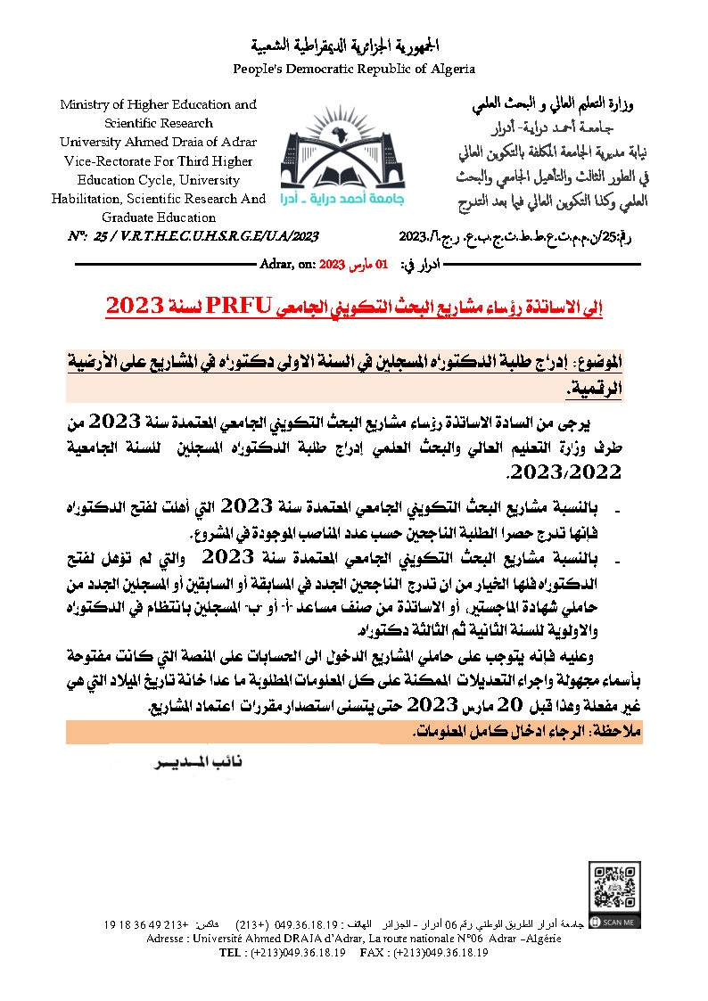 إدراج طلبة الدكتوراه المسجلين في السنة الاولى دكتوراه في المشاريع على الأرضية الرقمية 1٬046 Share FacebookGoogle+البريد الإلكترونيTwitter