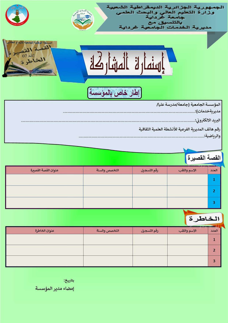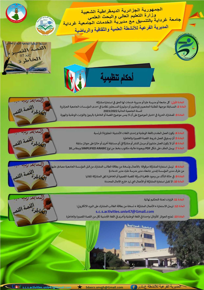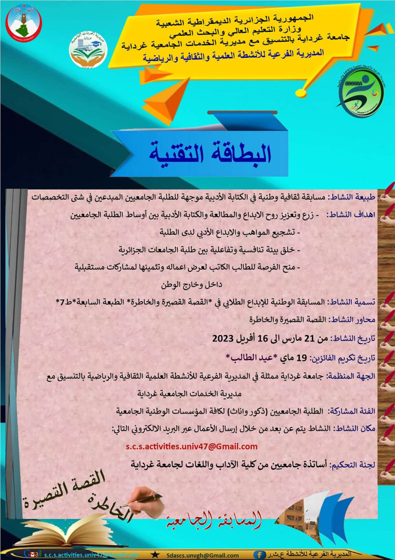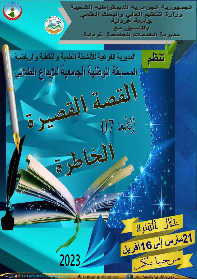 المسابقة الوطنية الجامعية للإبداع الطلابي في” القصة القصيرة والخاطرة” الطبعة السابعة” 1٬144 Share FacebookGoogle+البريد الإلكترونيTwitter