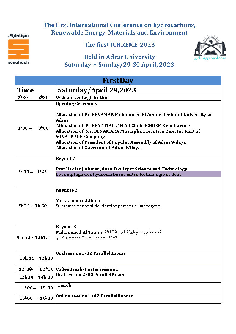 برنامج المؤتمر الدولي للمحروقات والطاقات المتجددة ، المواد والبيئة to download the programme : The first International Conference on hydrocarbonsRenewable Energy, Materials and Environment 1٬242 Share FacebookGoogle+البريد الإلكترونيTwitter