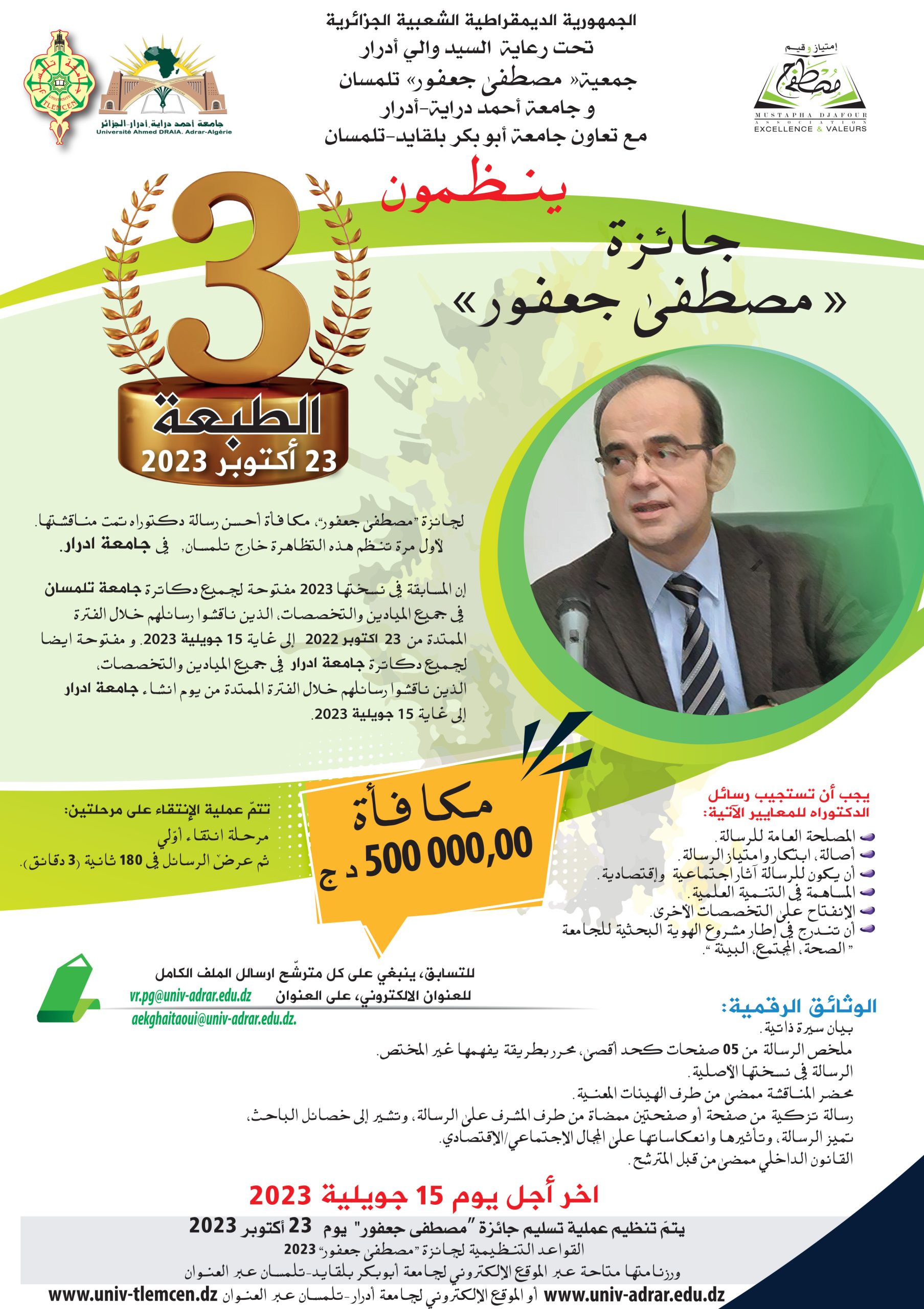 دعوة الى جميع دكاترة الجامعة لترشح لجائزة “مصطفى جعفور 2023 ” في طبعتها الثالثة 23 أكتوبر