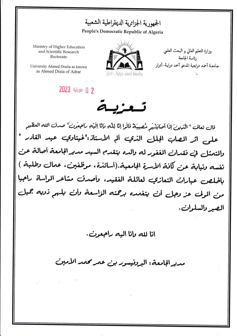 تعزية إلى الاستاذ منصوري هواري