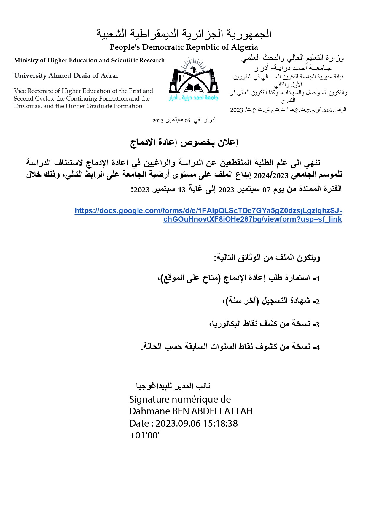 إعلان بخصوص إعادة الإدماج للدخول إلى رابط الأرضية يرجى الضغط على : https://docs.google.com/forms/d/e/1FAIpQLScTDe7GYa5gZ0dzsjLgzlqhzSJ-chGOuHnovtXF8iOHe287bg/viewform?usp=sf_link للتحميل : 1- إعلان بخصوص إعادة الإدماج 2- استمارة طلب إعادة الإدماج 14٬393 Share FacebookGoogle+البريد الإلكترونيTwitter