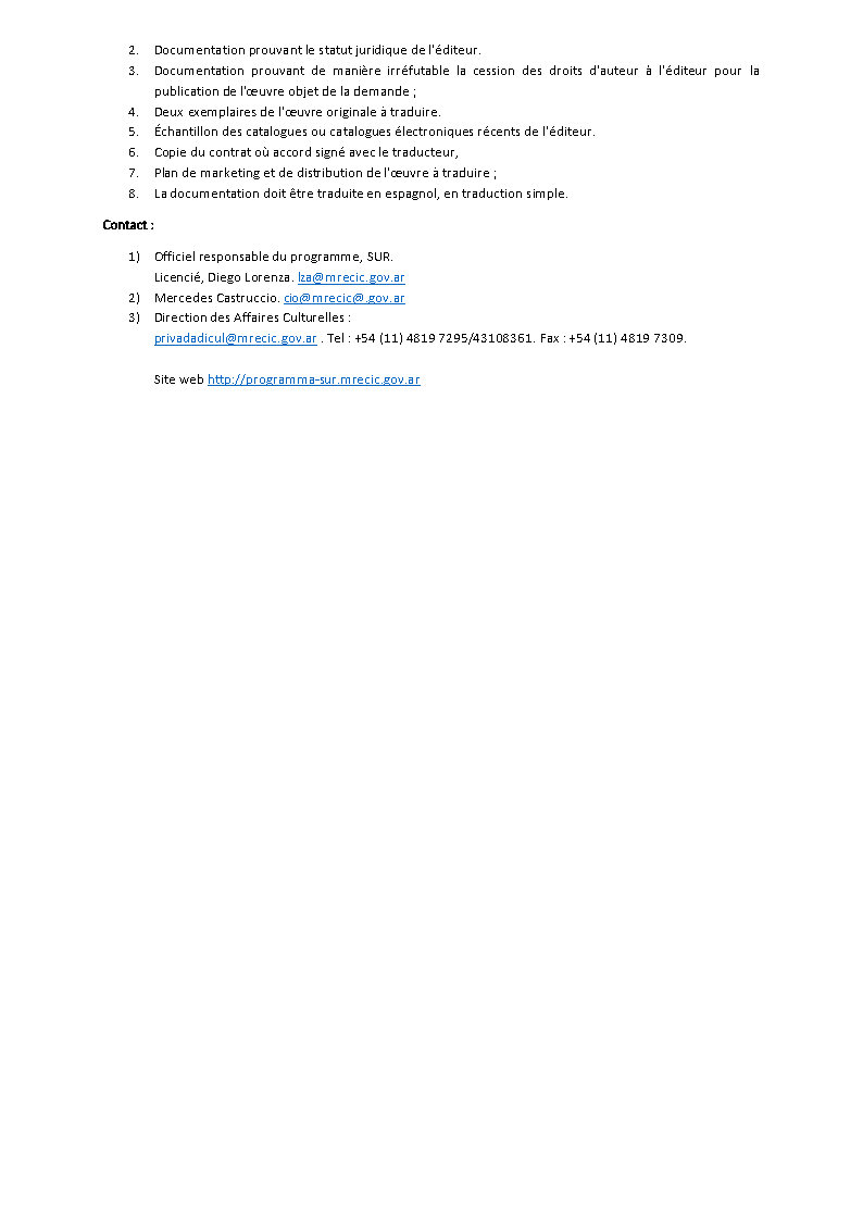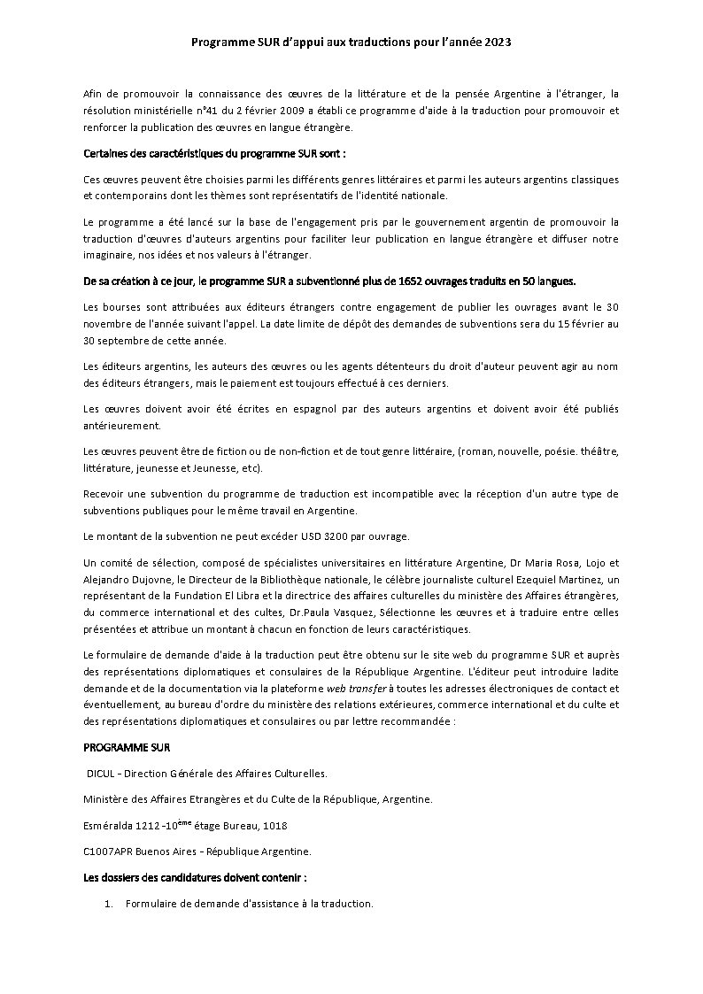 A/s programme argentin ‘’SUD’’ d’appui aux traductions pour l’année 2023 810 Share FacebookGoogle+البريد الإلكترونيTwitter