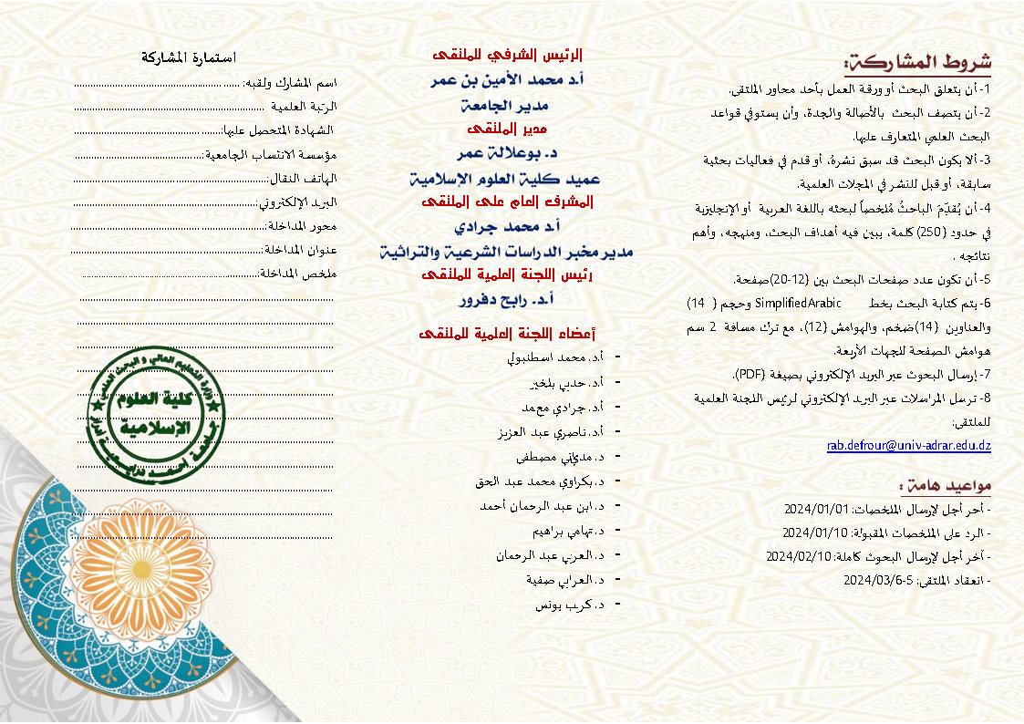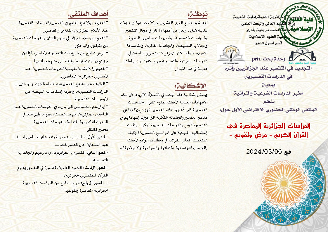الملتقى الوطني الحضوري الافتراضي الأول حول : الدراسات الجزائرية المعاصرة في القرآن الكريم – عرض وتقويم – في 2024/03/06 1٬479 Share FacebookGoogle+البريد الإلكترونيTwitter