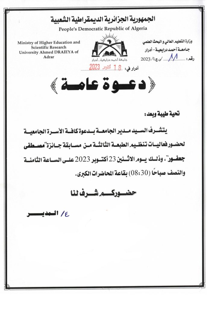 دعوة عامة لحضور فعاليات تنظيم الطبعة الثالثة من مسابقة جائزة “مصطفى جعفور” 617 Share FacebookGoogle+البريد الإلكترونيTwitter