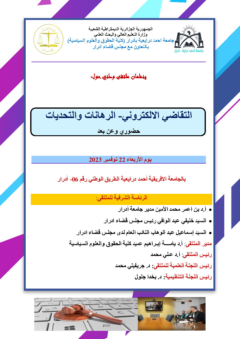 الملتقى الوطني حول التقاضي الالكتروني- الرهانات والتحديات حضوري وعن بعد يوم الأربعاء 22 نوفمبر 2023 لتحميل مطوية الملتقى : الملتقى الوطني حول التقاضي الالكتروني- الرهانات والتحديات 2٬340 Share FacebookGoogle+البريد الإلكترونيTwitter