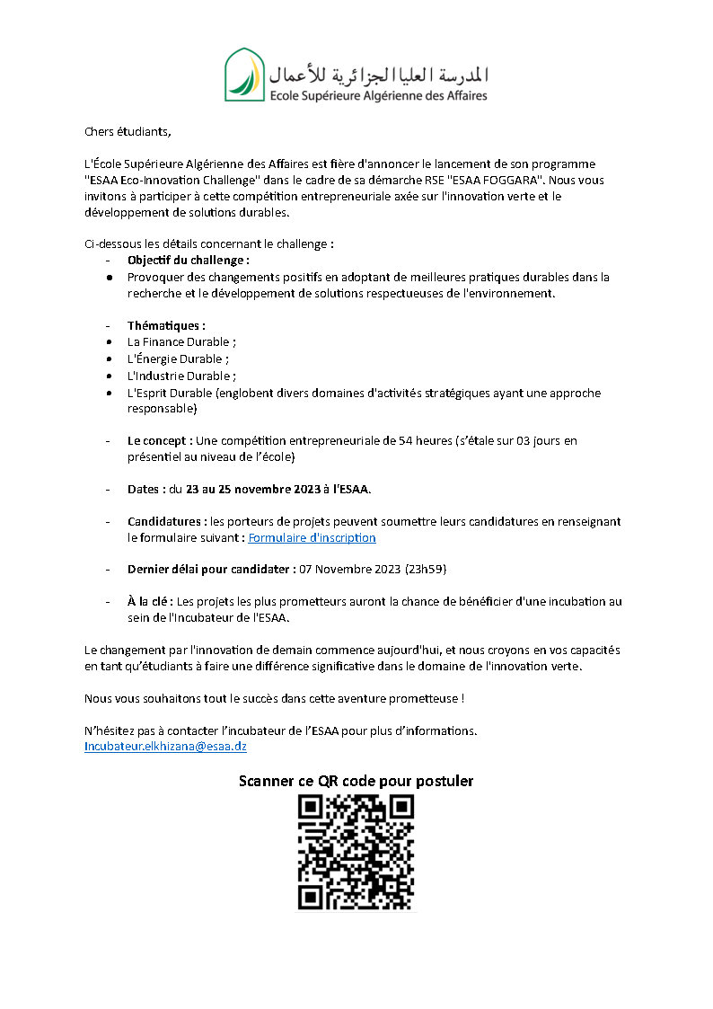 Invitation ESAA Eco-Innovation Challenge pour télécharger: Invitation ESAA Eco-Innovation Challenge 878 Share FacebookGoogle+البريد الإلكترونيTwitter