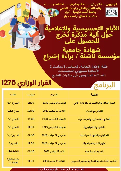 الأيام التحسيسية حولة آلية مذكرة تخرج للحصول على شهادة جامعية – مؤسسة ناشئة/براءة إختراع 1٬238 Share FacebookGoogle+البريد الإلكترونيTwitter