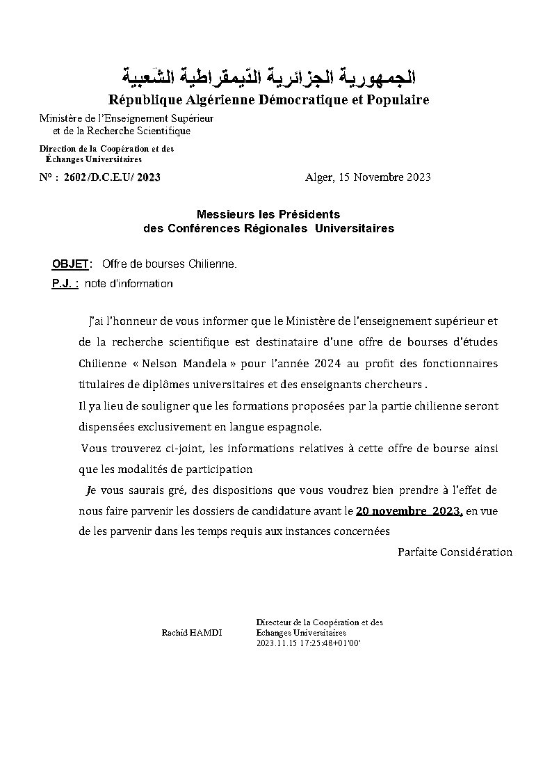offre de bourses chilienne pour télécharger : documents bourse Chilie 507 Share FacebookGoogle+البريد الإلكترونيTwitter