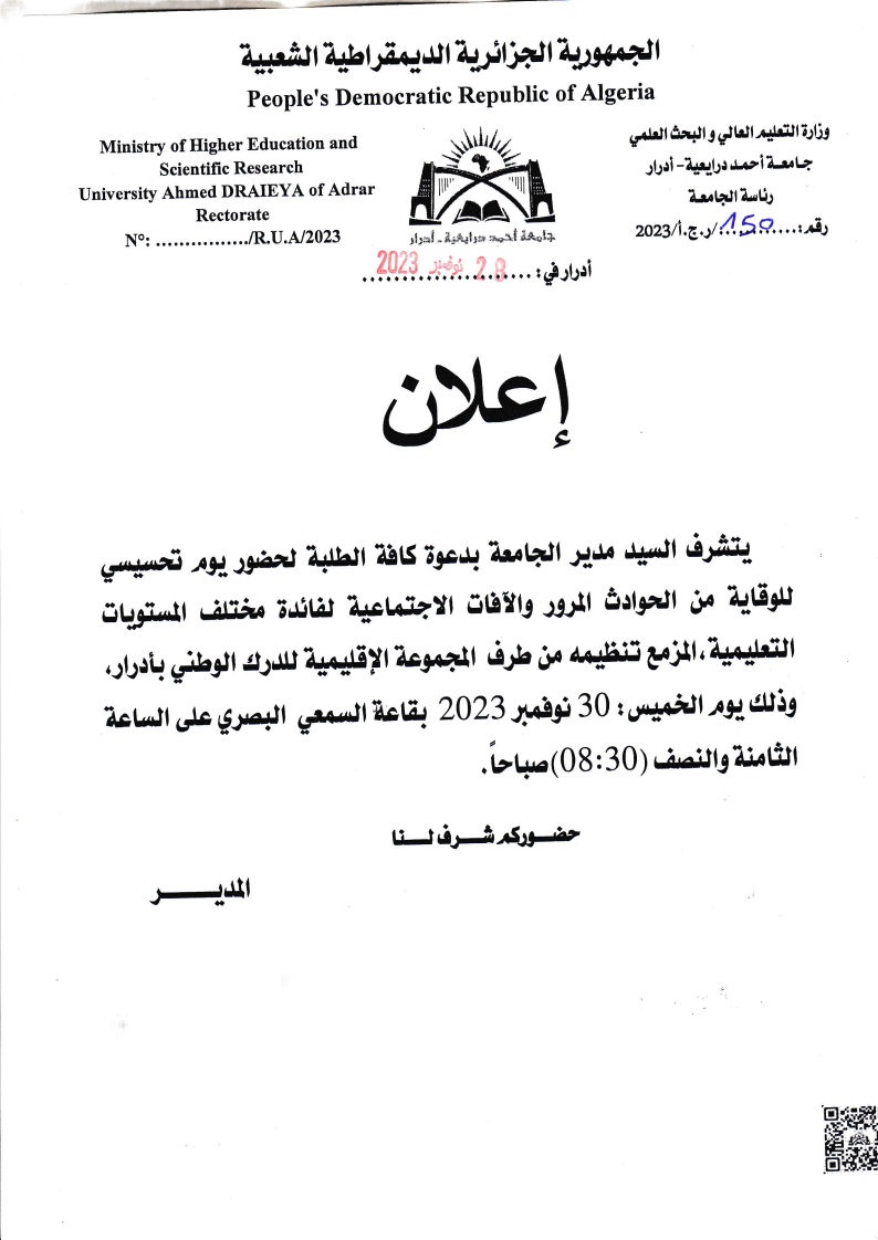 دعوة لكافة الطلبة لحضور يوم تحسيسي للوقاية من حوادث المرور والآفات الاجتماعية 1٬099 Share FacebookGoogle+البريد الإلكترونيTwitter