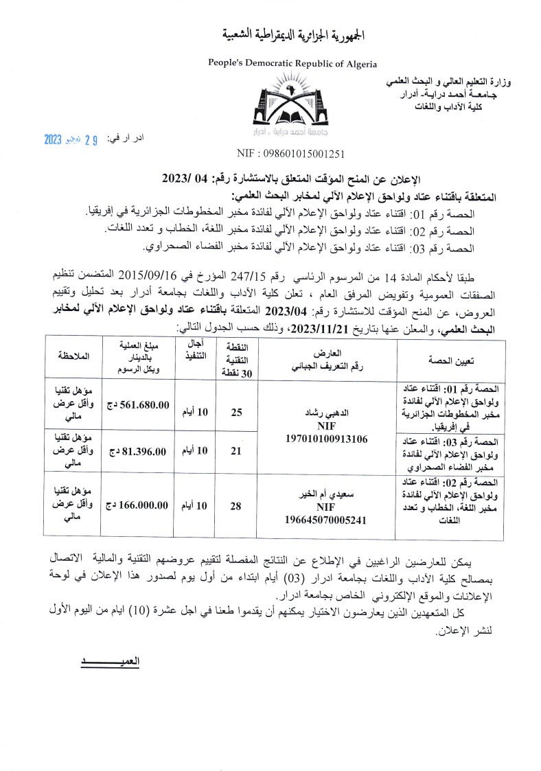 المنح المؤقت للاستشارة رقم 2023/04 المتعلقة باقتناء عتاد ولواحق الإعلام الآلي لمخابر البحث العلمي كلية الآداب واللغات 963 Share FacebookGoogle+البريد الإلكترونيTwitter