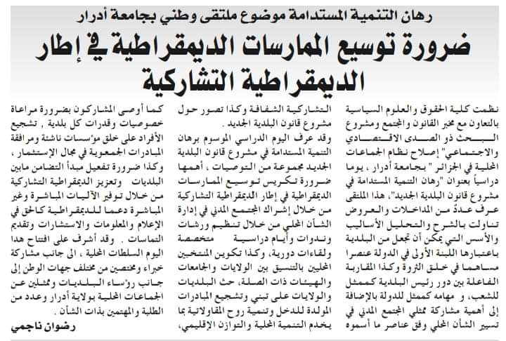 رهان التنمية المستدامة موضوع ملتقى وطني بجامعة أدرار ضرورة توسيع الممارسات الديمقراطية في إطار الديمقراطية التشاركية 694 Share FacebookGoogle+البريد الإلكترونيTwitter