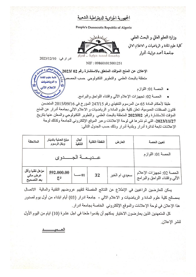 المنح المؤقت للاستشارة رقم 2023/02 المتعلقة بالبحث العلمي والتطوير التكنولوجي حسب الحصص لكلية علوم المادة والرياضيات والاعلام الآلي 1٬112 Share FacebookGoogle+البريد الإلكترونيTwitter